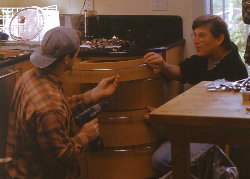 - Michael and John, finishing the Farver, anigre, hand-made cabinets — San Francisco, 1990s